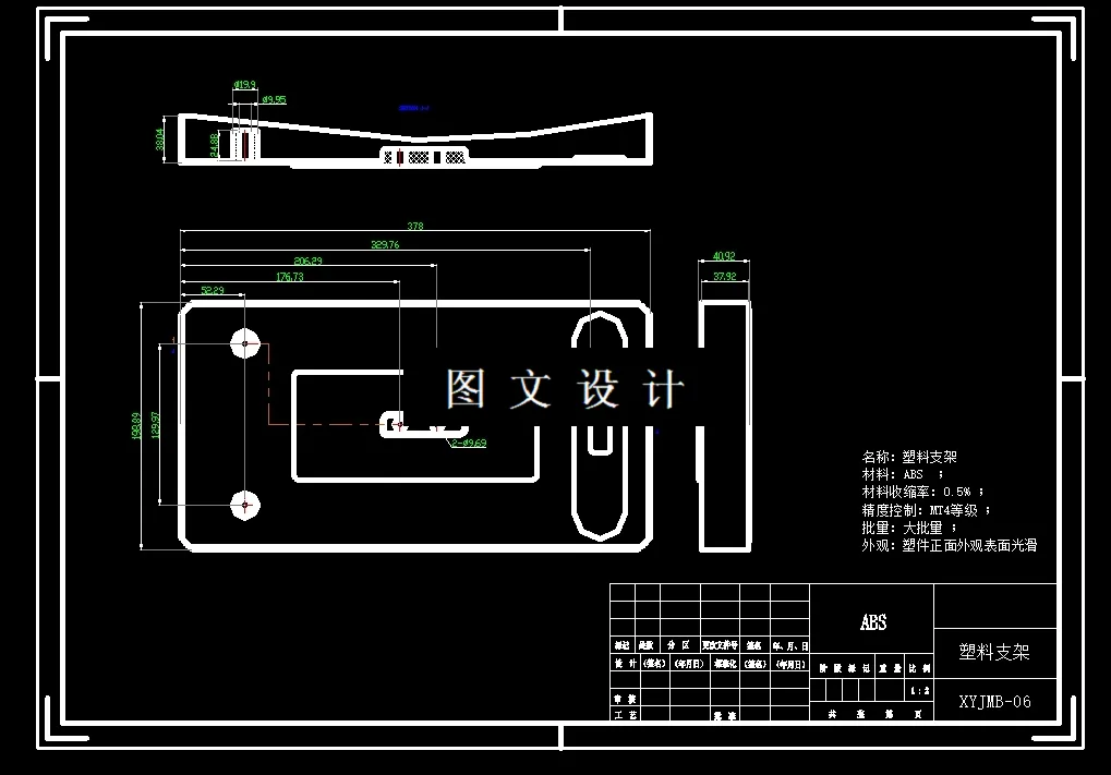 此设计为塑料支架注塑模具设计,采用一模二腔,侧浇注口进行填充,提供三维(UG格式)+