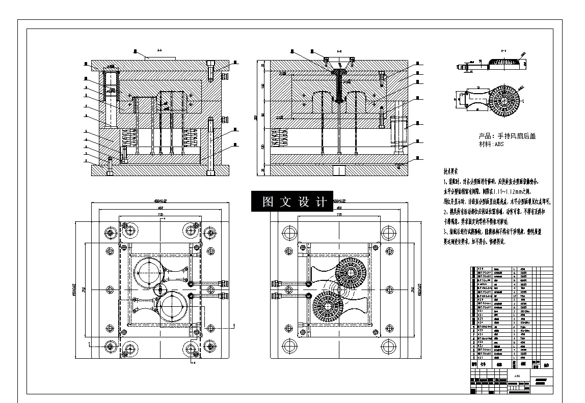 手持风扇底壳注塑模具设计,一模二腔,侧浇口,两板式模架。提供三维(UG格式)+二维装配图及主要零件图+设计报告文档( 文档为约1.8W字 48页)+模流分析。