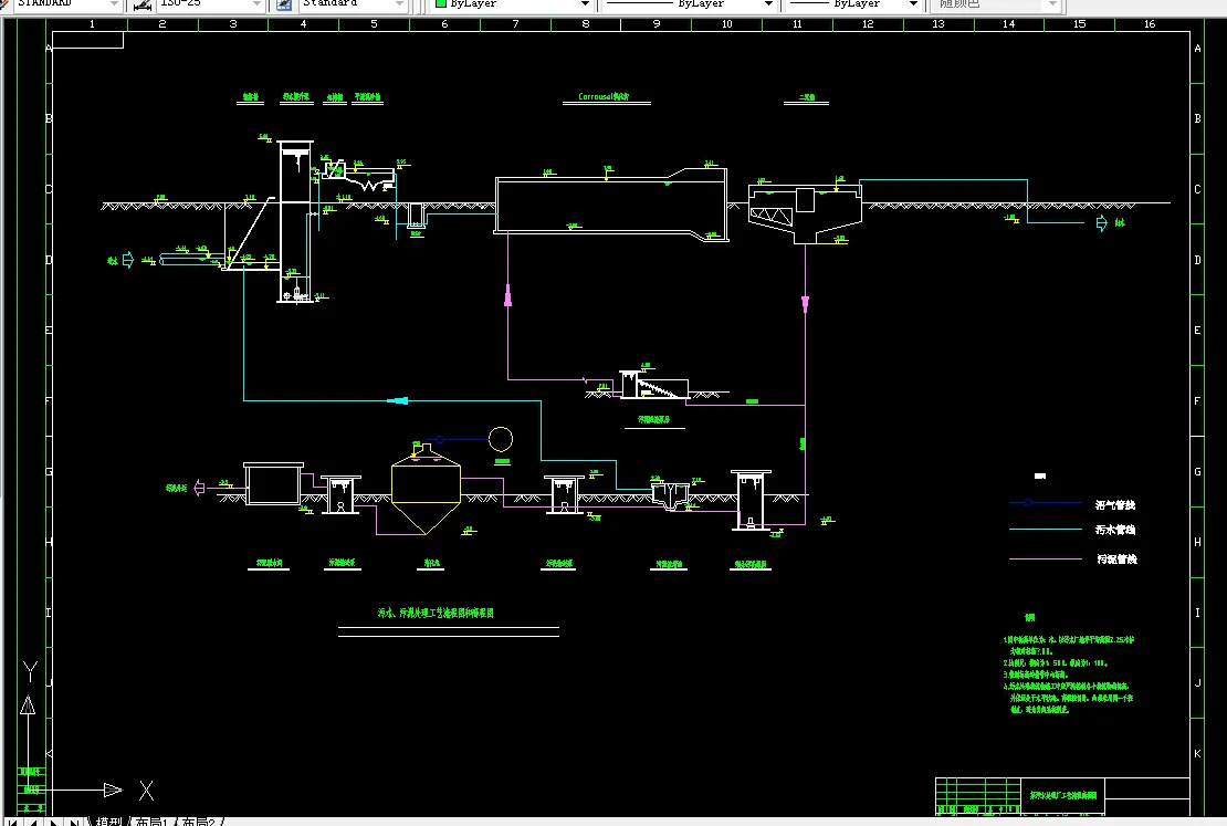 其中初步设计要完成设计说明书一份、污水处理厂总平面布置图一张、高程图一张,流程图一张,主要设备图一张,管道布置图一张;单项处理构筑物施工图设计中,主要是完成氧化沟平面图和剖面图。