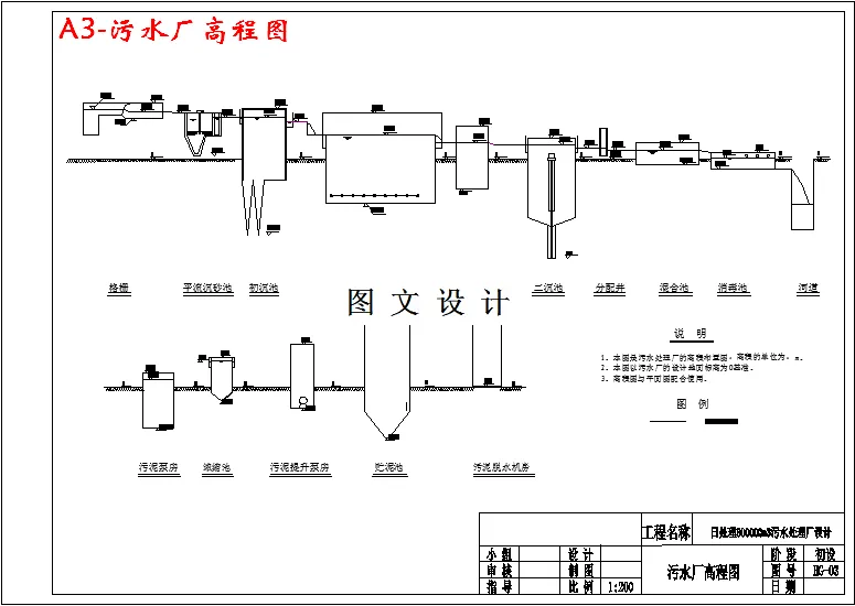 设计要求和基本资料:污水水量: 300000m3/d,污水水质:COD=380 mg/L,BOD=200 mg/L,SS=180 mg/L,NH3-N=40 mg/L,TN=50 mg/L,TP=8mg/L。 处理后出水要求:达到《污水综合排放标准》(GB8978-1996)一级标准B: COD<60mg/L,BOD<20 mg/L,NH3-N<8mg/L,TN<1.0mg/L,TP<15mg/L。工艺选择要求:倒置A2/O工艺。把常规脱氮除磷系统的厌氧、缺氧环境倒置过来,可得到更好的脱氮除磷效果。其特点在于:a缺氧区位于厌氧区之前,硝酸盐在这里消耗殆尽,厌氧区ORP较低,有利于微生物形成更强的吸磷动力;b微生物厌氧释磷后直接进入生化效率较高的好氧环境,其在厌氧条件下形成吸磷动力可以得到更充分利用;c缺氧段位于工艺的首端,允许反硝化优先获得碳源,进一步加强了系统的脱氮能力。倒置A2/O工艺与常规A2/O工艺的小型系统平行对比试验表明,倒置A2/O工艺的氮磷脱除功能明显优于常规A2/O工艺,其COD去除能力与常规A2/O工艺相当。
