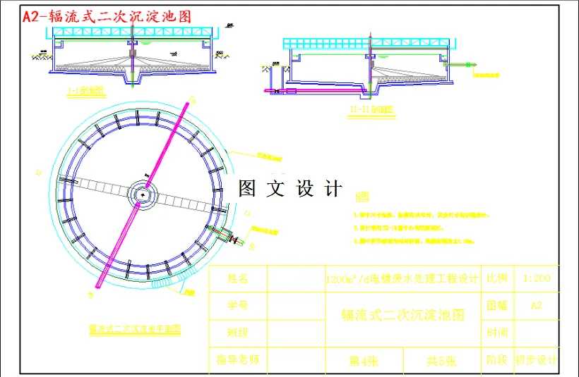 本设计是针对某电子厂的综合电镀废水进行处理,其水质情况为 PH:4—8、 Cu2+:5mg/l、CODCr:300mg/l、氨氮:15mg/l、SS:100mg/l、CN-:0.08mg/l、 而含镍废水的 Ni 2 浓度为 30mg/L,但在前期处理中已 100%回用。其中,规定 在车间或生产设施排放口监控的污染物,需在车间或生产设施排放口收集和处 理;规定在总排放口监控的污染物,需在废水总排放口收集和处理。经过本设计 处理后其水质情况为 PH:6—9、Cu2+:0.3mg/l、CODCr:50mg/l、氨氮:4.72mg/l、 SS:8.1mg/l、CN-:0.05mg/l。本工程的总投资为 314.62 万元,其中工程费用为 143 万元,设备费为 73.64 万元,其他费用为 27.1 万元,药剂费为 70.88 万元,单 位处理成本为 7.18 元/m3 污水。