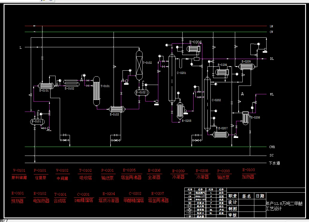 当今工业生产二甲醚的方法有气相法和液相法,本工艺选用气相法。该工艺的主要过程有:先把甲醇通过加热器加热成蒸汽,然后加热蒸汽通过催化剂床层,最后甲醇脱水生成二甲醚,然后分离出二甲醚。该工艺选择的催化剂是铝改性的催化剂。在本工艺设计中先通过物料衡算,能量衡算来确定该工艺生产所需的塔,泵,换热器等工艺设备,然后通过已有的设备画出工艺流程图,设备图,厂房布置图等。