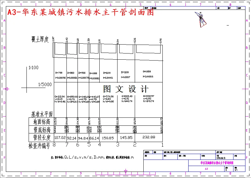 污水处理水量:为城市管网设计确定的最大污水流量。这个城市中,污水处理厂的设计应该考虑到最大污水处理量。污水处理厂的各处理构筑物以及厂内连接各处理构筑物的灌渠,都应满足设计最大流量的要求。 污水水质:CODcr:450mg/L,BOD5:200 mg/L,SS:250 mg/L,氨氮15 mg/L。在最大设计充满度的情况下,通过设计流量时的污水流速称为设计流速。为了防止污水中的泥沙颗粒沉淀产生淤积 ,阻塞管渠,规定污水管道的最小设计流速为0.6m/s ;污水管渠的最小流速为0.4m/s ;为了防止因污水流速过大对管道造成冲刷损坏,规定金属管道的最大设计流速为10m/s,非金属管道最大设计流速为5m/s。控制点为管道系统的最小埋深点,对整个管道系统的高程起控制作用,一般可以取某一干管的起点、工厂排出口或排水流域中地面高程最底处。869501