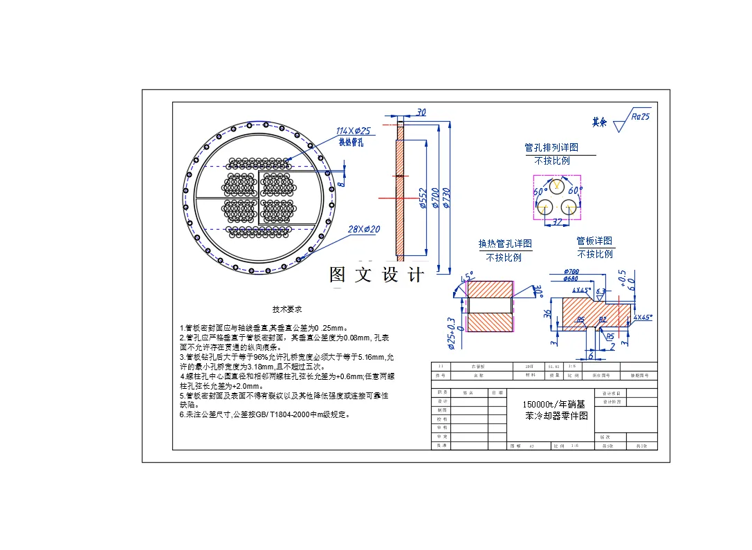 换热器的工作原理通过固体物质之间的导热性质,热介质先将固体物质加热到一定温度,冷介质再从固体物质获得热量,通过此过程可实现热量的传递。本次设计的是有关于硝基苯冷却器,依据任务书中的参数要求,选择固定管板式换热器的类型较为合适。这次设计的主要流程是,首先搜集相应换热器的发展前景,确定设计方案,完成设计的前期材料准备,对冷却器的工艺计算,结构设计,经济核算等进行计算。在工艺设计中,明确了相应介质的物性参数,对换热面积进行了估算,确认了设计选定为6管程换热器,对传热系数、压力降进行了校核。在结构设计与计算中确定了冷却器的材料,对封头,管板,管箱等进行了相应的计算,法兰、支座的选择与校核。在设计中,在管板的设计计算中涉及了大量的计算与标准的确定,对6种危险工况都进行了相应的强度检验和拉脱应力的校核。最终对冷却器制造所需要的成本进行了估算。