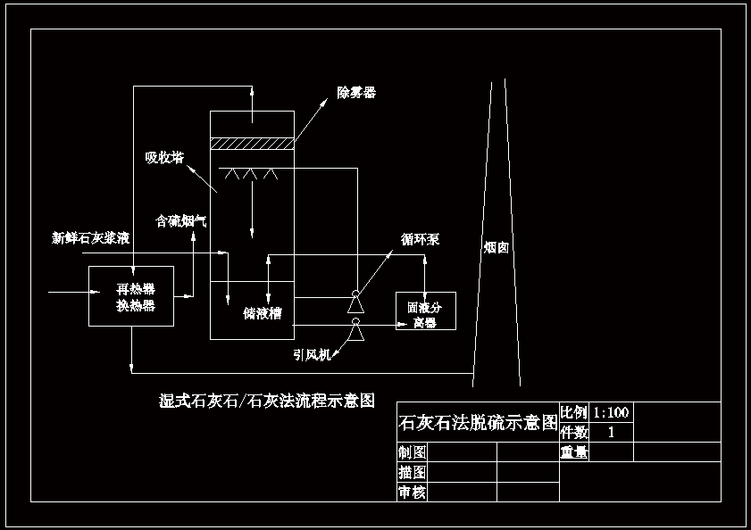 SG-400-140型火电厂锅炉中硫烟煤烟气湿式石灰法脱硫尘系统设计 锅炉烟气除尘脱硫工艺与脱硫方法有关。 干法脱硫:先除尘后脱硫; 湿法脱硫:多种方法。视实际情况而定。 可行的途径有:1)利用现有除尘设备,设计脱硫装置; 2取消原除尘设备,设计除尘脱硫新系统。 本例题拟采用先有除尘设施,后加脱硫装置的工艺。 其流程为:锅炉烟气—除尘设施—脱硫设施—烟囱排放