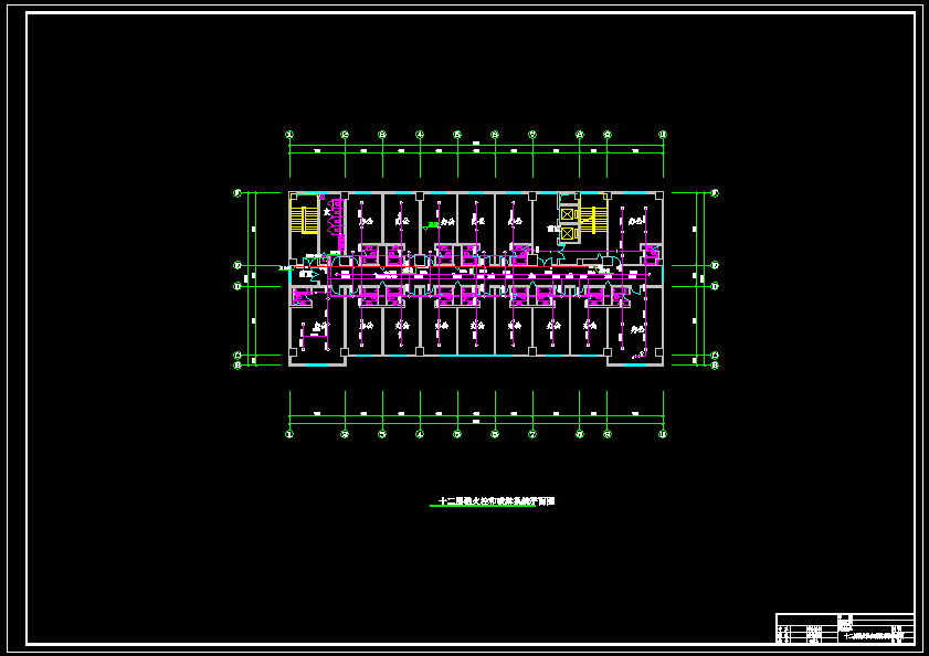 十二层(地下一层)9000平米办公楼消防给排水及灭火系统设计 本设计是对某办公楼给排水系统及灭火系统设计。参照规范本建筑被规定为二类高层建筑。室内消火栓取直径为65mm的栓口,19mm的喷嘴直径,25m长的水带,材料取胶质材料,确定室内消防用水量为25.5L/s,通过系统水力计算得到水泵的扬程为80m,选用型号DFW100-250/2/37的消防水泵两组一用一备。建筑消防水箱的容积为15.3m3,消防水池的容积为183.6m3,水泵接合器的数量为2个。增压稳压设备型号为ZW—I-X-13型。室外消火栓布置3个地上式临时高压消火栓。自动喷水灭火系统通过系统水力计算得到系统的设计流量为21.979L/s,水泵的扬程为77m,选用型号为DFW80-250(Ⅰ)/2/37的喷淋水泵两组,一用一备。该建筑的消防水箱的有效容积为14m3,消防水池的有效容积为159m3,水泵接合器的数量为2个。增压稳压的设备为ZW(L)-Ⅱ-Z-A型。使用CAD绘制出平面布置图与系统图。