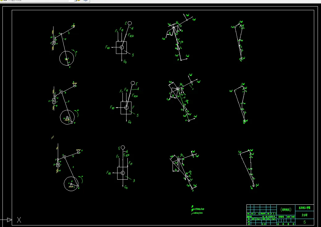 首先,根据六连杆机构运动的几何规律,计算出各杆的长度,由各杆之间的相对位置绘制机构运动简图。选取曲柄不同的位置,使用平面运动的知识(基点法),选取合适的比例尺,绘制杆件的速度和加速度多边形,确定杆件的速度和加速度。