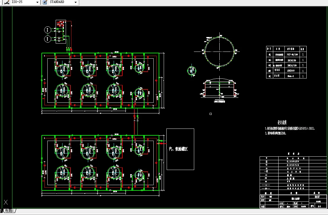 绘图部分依据计算说明、规范和经济因素,在满足生产要求的条件下,进行了较为经济合理的布局,并为油库将来的扩建和发展留有余地。