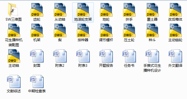 本设计是根据国内外农业播种机的发展趋势,本着良好实用性、适应性和结构简单便于操作的原则,从而设计的一种新式手推式花生播种机。该机在结构上的优点,能适应多种田地的播种。小到1-2分大的田块,大到上百亩的田块,不管是平坝、还是浅丘地区;无论是板结的土质,还是疏松的土质都能适应。本设计着重考虑了播种机的原理,包括链条链轮传动机构、排钟排肥机构、种箱、地轮、压土轮、覆土器、开沟器和整体机架组成。从机器运动的功能出发,按类比法以及变异—组合法完成机构的构件和设计,使结构紧凑,体积小,噪音小、无污染,使用方便灵活的特点,适合一般土地环境的播种。采用手推提供动力,无需引擎驱动,达到了节能环保的目的,而且使用安全、可靠,便于维护。
