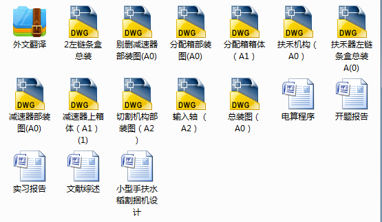本文主要是应用机械设计方法对小型手扶水稻割捆机每个零件进行尺寸设计,对主要的传动零件进行受力分析和强度计算,用AutoCAD和软件进行设计和绘图,初步完成了整机的设计并整理出图纸.