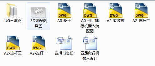 本课题是设计四足爬行机器人的防撞躯干以及它的四肢。四足爬行机器人防撞性取决于材料的刚度和强度,身体躯干的造型也是防撞性的一个要求。不一样的结构其受冲击的强度也不一样。腿部自由度设置:每条腿 3 个主动自由度(髋部前后、髋部上下、膝部上下)和 1 个被动自由度(踝部)。主动自由度拟采用电机驱动;被动自由度由弹簧实现。由于整体的的设计工作比较多,所以我只负责设计机械结构这一部分,这一部分包括了防撞框架选用的金属材料,对其进行三维建模和静力学分析,四足机器人的每条腿连接的连接方式,每一足采用不同的伺服电机控制两个连杆,共采用 8 个伺服电机控制,通过不同的转速,实现行稳定性要求以及四条腿的收缩及三个自由度的分析。