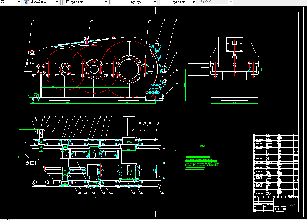 总体设计后部分所涉及的减速器采用了三级展开式圆柱齿轮结构。齿轮材料为40Cr,并经调质及表面淬火。校核齿轮、轴、键、轴承确保了设计的实际可行性。