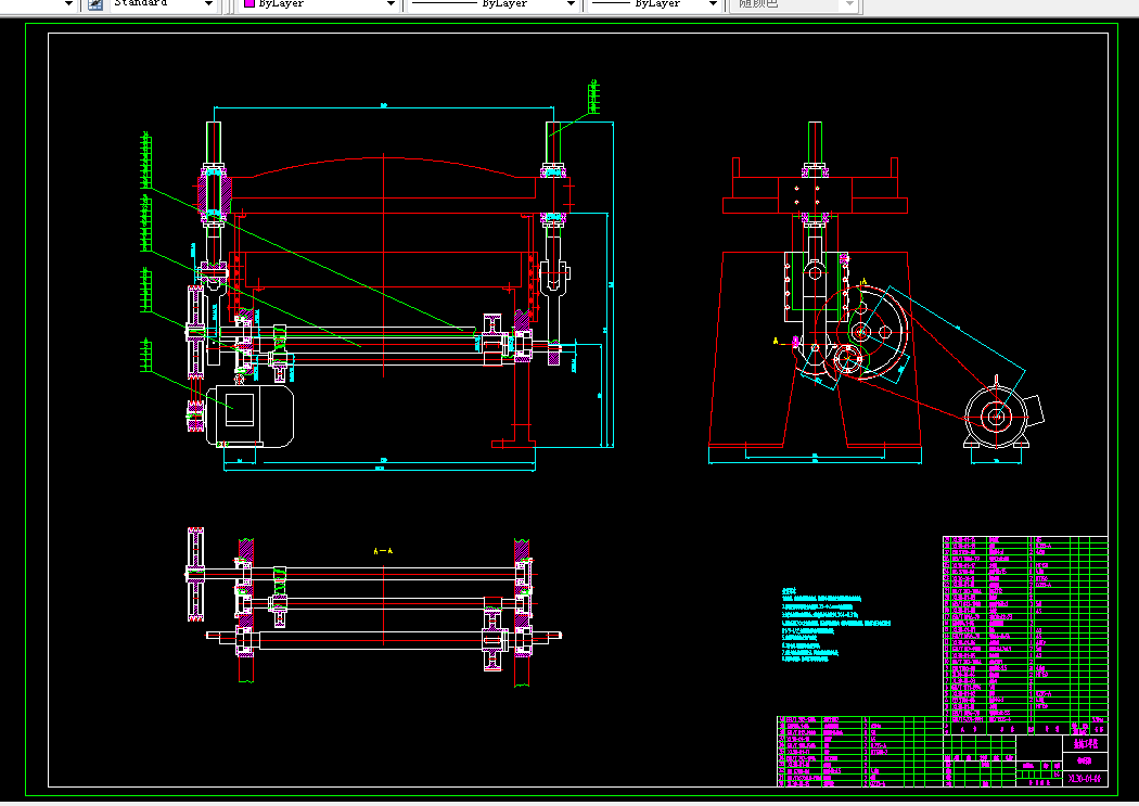 摘要:本课题来源于企业中,主要完成龙门皮革下料机的总体设计和传动系统的设计。设备的最大分切力为3T,最高频次为30次/min,工作台尺寸为(L*W)1200*800mm。龙门皮革下料机主要适用于各种皮革、塑料、橡胶等行压成型,以机械代替手工开裁坯料之用。该设备要求冲裁速度快、压力大,位移精度高,生产效率高、噪音低,操作方便,性能可靠等特点。该设备主要通过带传动及二级齿轮传动带动曲柄滑块机构运动,通过曲柄滑块机构将旋转运动转变为直线运动,使上工作台作往复上下直线运动。驱动元件采用三相异步交流电动机。在设计中利用带传动和斜齿轮传动,提高传动的平稳性。另外配有蜗轮蜗杆机构,其主要是起调节上压盖的行程的作用。在满足设计要求的前提下降低了成本,且满足下料分切干燥要求,工作行程调整方便,适合大批量生产。