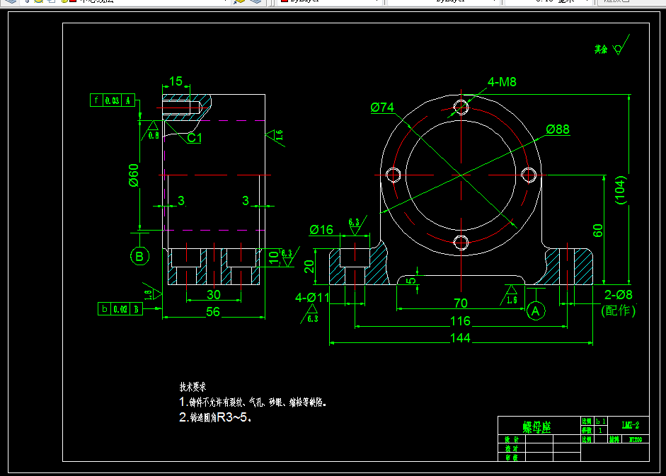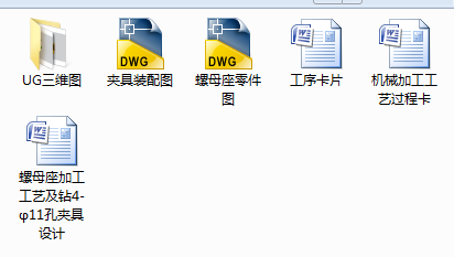 本设计主要任务是完成 螺母座钻4-Ф11 孔的工装夹具设计。首先完成了该零件的机械加工工艺规程设计,主要包括:零件三维 CAD 模型的建立、结构分析、毛坯的制备方法、加工表面精度要求和各表面的形状位置精度分析、精基准和粗基准的选择,为各表面选择了合理的加工方法和机床,以及各工序切削参数的确定,编制了完整的机械加工工艺过程卡,设计了钻4-Ф11孔的工序卡片。