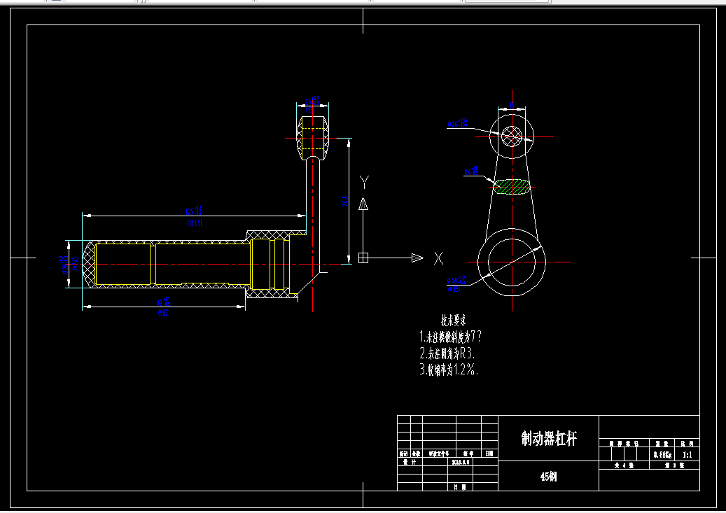 本次设计是对制动器杠杆零件的加工工艺规程及一些工序的专用夹具设计。制动器杠杆零件的主要加工表面是铣键槽、车轴部分外圆面及退刀槽、铣杠杆头左右两端面及钻孔,本套夹具针对于车退刀槽设计。由加工工艺原则可知,保证平面的加工精度要比保证孔的加工精度容易,所以本设计遵循先面后孔的原则,并将孔与平面的加工明确分为粗加工和半精加工阶段以保证加工精度。基准选择以制动器杠杆大外圆端面和杠杆头右端面作为粗基准,以杠杆大外圆端面互为基准加工出端面,再以端面定位加工出工艺孔。在后续工序中除个别工序外均用端面和工艺孔定位加工其他孔与端面。本套专用夹具是从零件的具体工序出发,以相关标准为参考设计的,因此能满足整个工序过程的加工要求和技术要求。