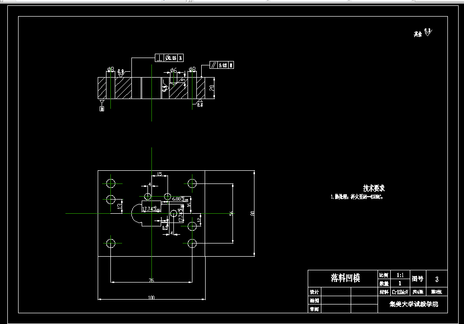 首先对冲压件进行分析,分析该零件的尺寸精度得出用一般精度的模具即可满足零件精度的要求,再根据零件的形状、尺寸标注及生产批量等情况,选择落料冲孔的方案。在本次设计不仅要考虑使零件能满足使用要求,还要保证模具的使用寿命。