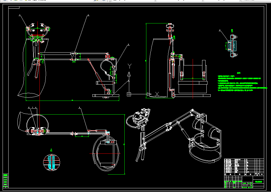 本文介绍了题目的研究背景和意义,论述了苹果采摘设备在国内外的发展 状况,阐述了本次设计研究的内容及方法。本次设计的主要内容是苹果采摘装置的总体方案以及装置的主要组成部分可穿戴装置、夹紧与传动装置、定位与切割装置的结构设计以及三位模型设计。本设计的可穿戴装置由平行四边形机构组成,可模拟人的手臂运动,运用背包式结构将平行四边形机构一端的短杆固定,气弹簧一端固定在上臂杆处,一端固定在腰上,本设计可实现装置的重力都由气弹簧承载,人的手臂不用受力,达到省力的目的。夹紧装置由剪刀机构组成。传动装置采用车闸,手握住闸的手柄,剪刀机构的两根杆相对运动,实现对苹果的夹紧。定位装置将苹果固定,切割刀将苹果柄切断。本设计充分考虑了装置的工艺性、合理性和经济性,设计过程参照了机械设计的基本原理,同时借鉴了其它机械的设计方法。本次设计的装置具有成本低、安装维修方便等特点。