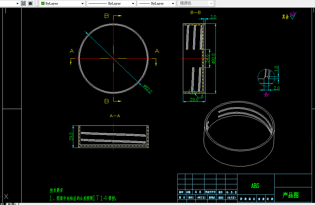 塑料是一种可塑性的合成高分子材料,具有重量轻且坚固,耐化学腐蚀, 电绝缘性好,价格便宜,可塑性好等特点,广泛应用于电脑、手机、汽车、电机、 电器、家电和通讯产品制造中。 注塑成形是成形塑件的主要方法之一, 是指使用注塑机将热塑性塑料熔体在 高压下注入到模具内经冷却固化获得产品的方法。注塑的优点是生产速度快,效 率高,操作可自动化,能成型形状复杂的零件,特别适合大量生产。 本次设计的产品为咖啡壶盖,具有重量轻,强度高,耐腐蚀,易清洁等 特点,为大批量生产产品。本次设计在针对产品进行工艺性分析后,确定模具分 型面、 型腔数目、 浇口形式、 位置大小; 其中最重要的是确定型芯和型腔的结构, 以及它们的定位和紧固方式。此外还进行了脱模机构的设计,合模导向机构的设 计,冷却系统的设计等。最后绘制完整的模具装配总图和主要的模具零件图及编 制成型零部件的制造加工工艺过程卡片。实践证明:该模具结构合理、可靠,并 能保证产品质量,对此类注塑产品的模具设计有参考价值。