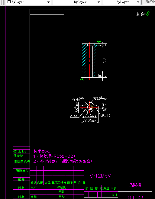 本次课程设计是完成垫圈冲压工艺及模具设计。采用落料、冲孔工艺。设计中分析了工件的冲压工艺性,计算了毛坯排样、冲压力、刃口尺寸计算等。进行了模具总体结构、主要零部件的设计,绘制了落料、冲孔复合模的模具装配图和零部件图。
