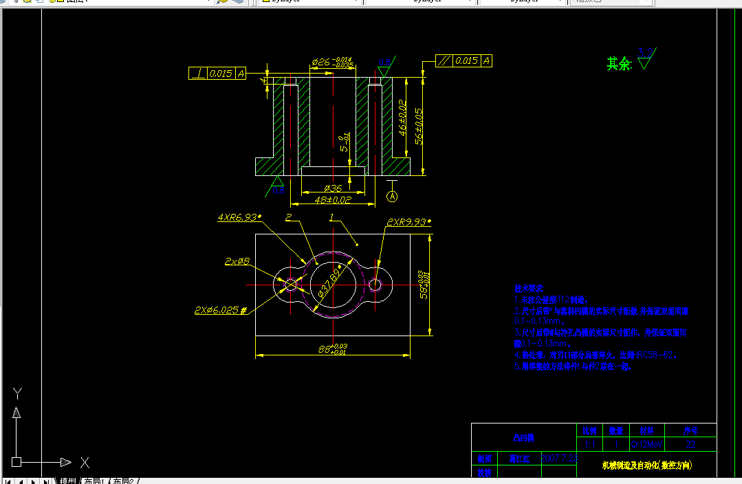 摘要:本文介绍了冷冲模具的结构、作用和特点。分析和设计冷冲模具的工艺、排样,各部分工艺力计算,以及冲压设备的选择。具体地分析了弹性元件的计算和选择以及模架选择。对主要工作零部件进行合理的工艺分析,并对多种方案进行分析和选择,从而选出最佳的设计方案。对主要工作机构进行理论数值计算。对主要的工作力进行校核。正确确定凸、凹模刃口尺寸及公差。