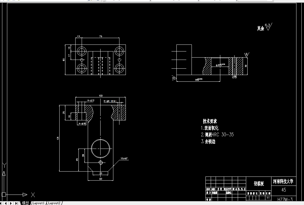本设计是为加工油缸后座上的两个M18×1.5的螺纹孔而设计的专用夹具——回转钻模。由零件图可知,这两对孔是在同一个圆周上,并且是大小和深度一样的孔,也就是它们的加工工艺相同,为了获得更好的位置度,提高加工质量,降低工人劳动强度,提高生产效率,该夹具应具备在一次装夹中,完成多工步加工,由以上的特殊性,经过多方面的考虑,确定了回转钻模的方案。