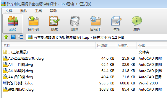 本说明书通过对汽车制动器调节齿板工艺的正确分析,在查阅了大量相关资料后,设计了一套精密冲压模具。本文从工艺分析开始对整个设计过程进行了详尽的介绍,叙述了模具成型零件的设计与加工工艺过程,主要零件的工艺参数的选择与计算,压力中心的计算,精冲压力机的选择等。本设计中对模具的结构进行了一定的改良和创新,使之更易操作和维修,在不影响工件质量的前提下,降低了生产成本。有利于精冲模具的普及和发展。