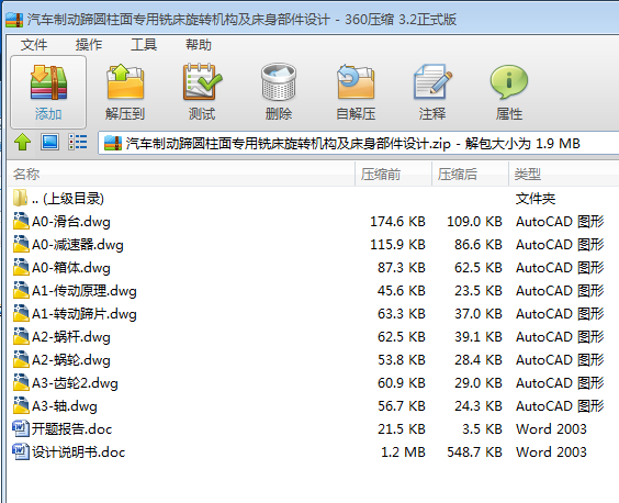 本设计目的就是设计一台可以加工制动蹄蹄片的专用铣床,此工件原来在车床上加工,切削的蹄片材料是石棉酚醛混合物,存在工人劳动强度大,装卸和夹紧困难,由于材料的特殊性、表面不连续性、以及其结构的复杂性等原因。存在切削时材料不宜脱落,生产效率低等缺陷。为克服以前采用车削加工时所产生的问题,设计了此专用铣床,采用旋转铣削法加工,成功解决了上述问题。