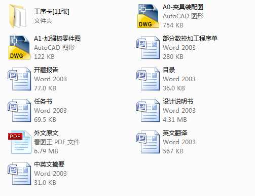 摘要: M5-5加强板零件是某航空产品中的一个薄壁零件,主要起支撑作用因而需要一定的强度和刚度,它是采用LC9铝合金材料,能满足其性能要求。航空产品一般是单件小批量生产,故适宜采用数控加工生产。本毕业设计课题的设计内容主要包括M5-5加强板零件数控加工和钻孔用组合夹具拼装两个部分。数控加工部分主要有零件的实体模型的建立、数控加工工艺规程编制、刀具、切削用量及主轴转速的选择,以及零件的仿真数控加工,并利用UG软件自动生成相应工序的数控加工程序。实体模型的建立是利用UG现有的块、圆柱体、圆锥体和球体四种简单的实体模型,通过建模合理性和参数化要求出发,根据M5-5加强板零件的特点创建符合数控加工的实体模型。根据粗、精加工分开的原则合理编制数控加工工艺规程。根据工件材料及所用机床选择适合的刀具及切削用量。组合夹具拼装部分主要有组合夹具的总体设计、相关组合夹具元件的选择,定位基准的选择及夹紧方法的选择以及加工误差精度分析。