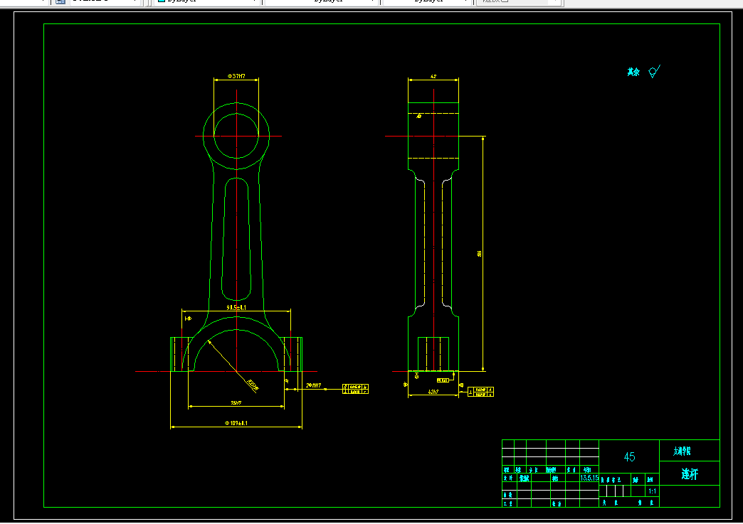 连杆是内燃机的主要传动件之一,正文主要论述了连杆的加工工艺及夹具设计。连杆的尺寸精度、形状精度以及位置精度的要求都很高,而连杆的刚性比较差,容易产生变形,因此在安排工艺过程时需要把各主要表面的粗精加工工序分开。逐步减少连杆加工余量、切削力及内应力的作用,以及修正加工后的变形,最后就能达到连杆的技术要求。连杆的主要加工表面为大、小头孔和两端面,较重要的加工表面为连杆体和盖的结合面及连杆螺栓孔定位面,次要加工表面为大头两侧面及螺栓座面等。