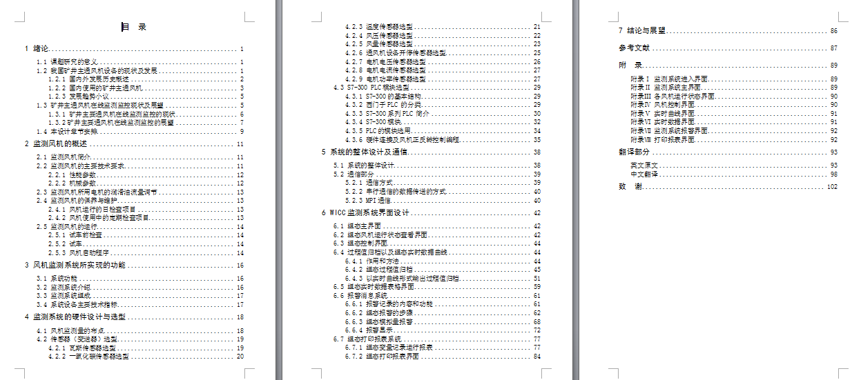 本课题设计的通风机性能监测系统,是在基于现行的各种通风机监测方法,并结合先进的测试技术而设计的。该系统以计算机为核心,选用了适合通风机运行环境的硬件,采用了WinCC组态软件,来实现通风机性能在线实时监测。在监测的基础上,还可以根据需要绘制出通风机的性能曲线和打印测试数据报表。在研制的过程中,采用了“软件即硬件”的思想,使监测系统的成本极大的降低。