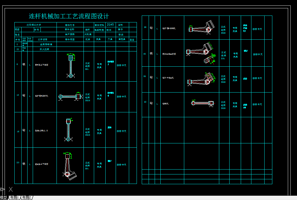 连杆加工工艺规程及夹具设计是包括零件加工的工艺设计、工序设计以及专用夹具的设计三部分。在工艺设计中要首先对零件进行分析,了解零件的工艺再设计出毛坯的结构,并选择好零件的加工基准,设计出零件的工艺路线;接着对零件各个工步的工序进行尺寸计算,关键是决定出各个工序的工艺装备及切削用量;然后进行专用夹具的设计,选择设计出夹具的各个组成部件,如定位元件、夹紧元件、引导元件、夹具体与机床的连接部件以及其它部件;计算出夹具定位时产生的定位误差,分析夹具结构的合理性与不足之处,并在以后设计中注意改进。