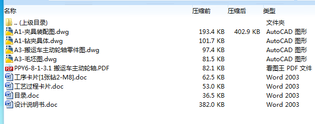 搬运车主动轮轴加工工艺规程及夹具设计是包括零件加工的工艺设计、工序设计以及专用夹具的设计三部分。在工艺设计中要首先对零件进行分析,了解零件的工艺再设计出毛坯的结构,并选择好零件的加工基准,设计出零件的工艺路线;接着对零件各个工步的工序进行尺寸计算,关键是决定出各个工序的工艺装备及切削用量;然后进行专用夹具的设计,选择设计出夹具的各个组成部件,如定位元件、夹紧元件、引导元件、夹具体与机床的连接部件以及其它部件;计算出夹具定位时产生的定位误差,分析夹具结构的合理性与不足之处,并在以后设计中注意改进。