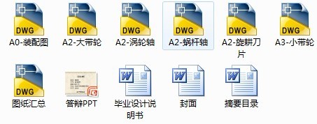 小型微耕机的定义为:发动机功率小于4.5kw的微耕机定义为小型微耕机。小型微耕机主要由发动机、工作部件、机架和传动系统几个部分组成。它具有重量轻,体积小,结构简单,耕作灵活等特点,具有很好的市场潜力。此次设计的微耕机耕幅为0.55m,配套采用的动力为3.6kw的垂直轴发动机。传动方式采用蜗轮蜗杆传动和皮带传动。设计的小型微耕机要保证安全性能和舒适性能,并且要具有很好的经济性。此次设计的微耕机采用压紧轮控制开关,当压紧轮压紧皮带时,皮带传动能够实现。当压紧轮放松时,皮带轮空转,不能实现传动。采用这种开关控制方式,能使机子的传动更加简单,经济性更好。设计的重点在于选择合适的旋耕刀片,发动机,蜗轮蜗杆,皮带轮,还有这些零件的空间分布。