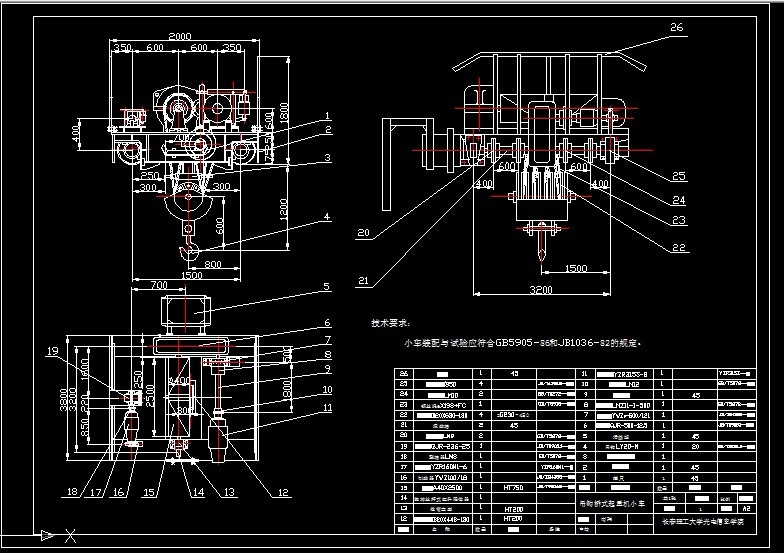 电动双梁起重机由桥架、小车运行机构、大车运行机构和电气设备构成。在系统整体设计中采用传统布局的典型结构,小车运行机构采用集中驱动。起升机构滑轮组采用双联滑轮组,重物在升降过程中没有水平移动,起升过程平稳,且钢丝绳的安装和更换容易。相应的卷绕装置采用单层卷筒,有与钢丝绳接触面积大,单位压力低的优点。在起升机构中还涉及到钢丝绳、减速器、联轴器、电动机和制动器的选择等。小车运行机构中涉及小车轮压计算、小车车轮、小车轨道、减速器、联轴器、电动机和制动器的选择计算等。