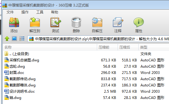 本说明书主要介绍了采煤机截割部的设计计算。MG400/900-3.3D型采煤机截割部主要是由一个减速箱和四级齿轮传动组成,截割部电机放在摇臂内横向布置,电动机输出的动力经由三级直齿圆拄齿轮和行星轮系的传动,最后驱动滚筒旋转。截割部采用四行星单浮动结构,减小了结构尺寸,采用大角度弯摇臂设计,加大了过煤空间,提高了装煤效果。