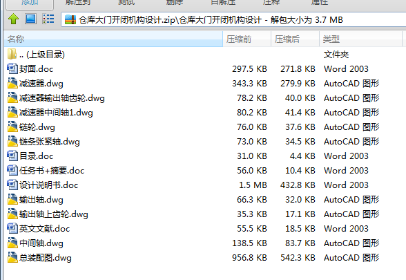 设计仓库大门,实现两扇门的同步开闭。主要传动形式为链传动,通过电机正反转实现大门的开与闭。在大门的两个极限有行程开关触点,从而可以使大门自动停在固定位置。在停电时能够用手动方式打开。