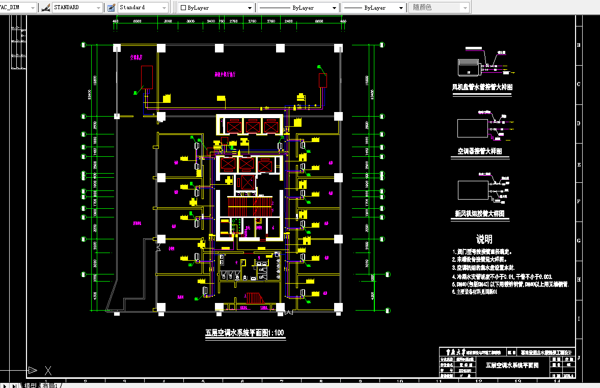 在设计中, 遵循暖通空调设计规范,,参阅了设计手册,设备选型时,根据样本上设备的运行情况和控制情况,对设备进行了修正。根据计算结果,并参照制图规范,绘制施工图。