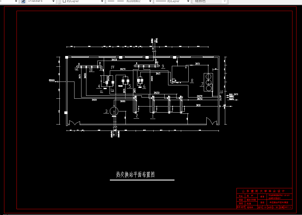 换热站位于图书馆地下一层0-9房间,占地面积204㎡。换热站管道穿越剪力墙处均有预留孔洞,穿越内隔墙自行打空,套管处理可参照相应验收规范。