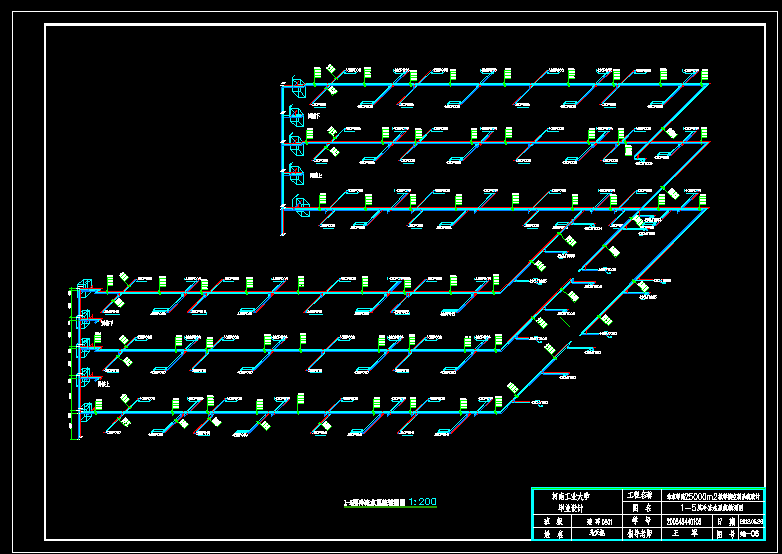 空调风管系统采用下送风方式,在每个教室布置两个风机盘管均匀送风,在每个楼层两侧分别布置一台新风机组,型号为FP180L和FP150L,空调水管系统在每个楼层两侧分别布置一根供水立管和回水立管。