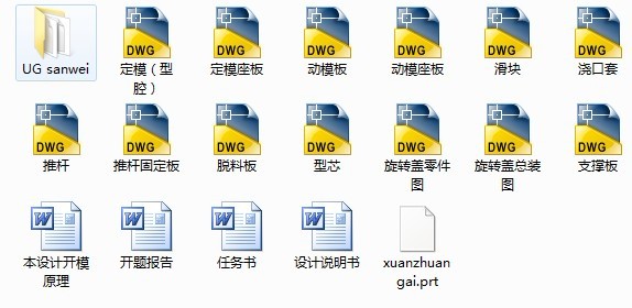 本文以旋转盖为对象,详细介绍其注射模设计过程。设计中主要运用了UG等不同的软件分别对塑件的三维结构、注射模成型部分零件、浇注系统、脱模机构等等进行了仿真设计和分析。最后进行了注射机型号的选择及校核、分型面的确定、型腔的设计、抽芯机构的设计、成型部分零件的设计、浇注系统、冷却系统、排溢引气系统、脱模机构的设计,复位系统的设计及其它零部件的设计。最后通过Autocad完成工程图的制作,并总结相关计算说明书。