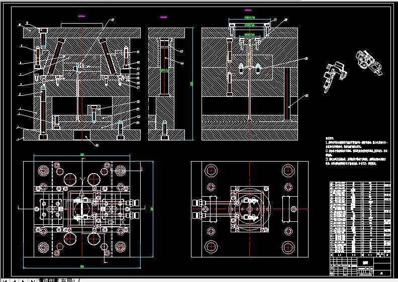 具体设计为:材料选用ABS;注射机选用时尽量选用国标注射机。该制件上下部分均需要抽芯机构,故需要设计上下层的侧型芯,具体通过滑块带动来完成制件的抽芯过程,进而顺利完成制件的脱模,最后有顶杆将制件顶出模外。