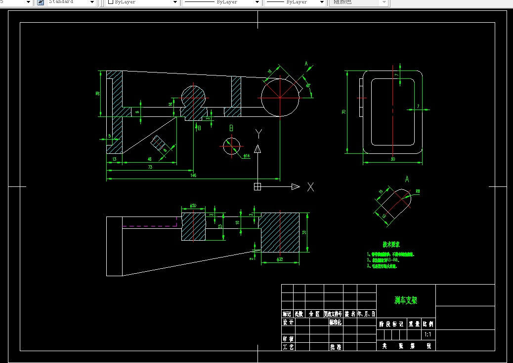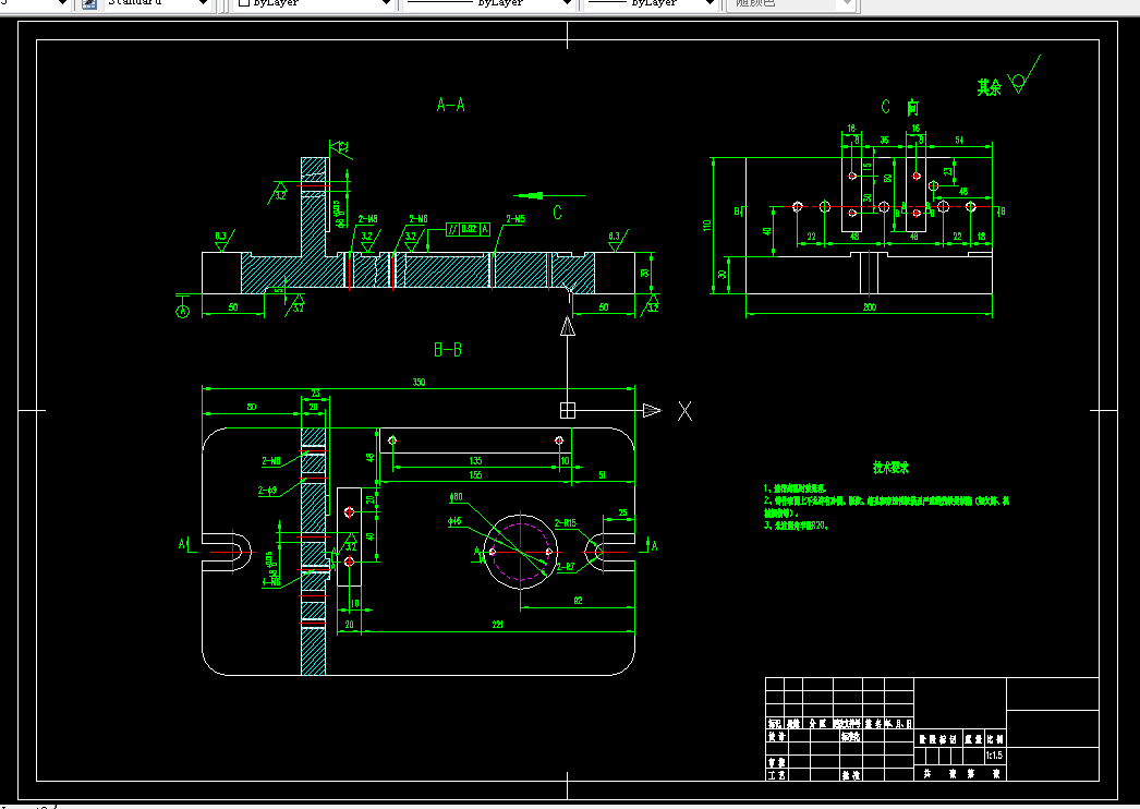 刹车支架的加工工艺规程及其钻、扩、铰Ф14H9、Ф16H9与铣A向面的夹具设计是包括零件加工的工艺设计、工序设计以及专用夹具的设计三部分。在工艺设计中要首先对零件进行分析,了解零件的工艺再设计出毛坯的结构,并选择好零件的加工基准,设计出零件的工艺路线;接着对零件各个工步的工序进行尺寸计算,关键是决定出各个工序的工艺装备及切削用量;然后进行专用夹具的设计,选择设计出夹具的各个组成部件,如定位元件、夹紧元件、引导元件、夹具体与机床的连接部件以及其它部件;计算出夹具定位时产生的定位误差,分析夹具结构的合理性与不足之处,并在以后设计中注意改进。