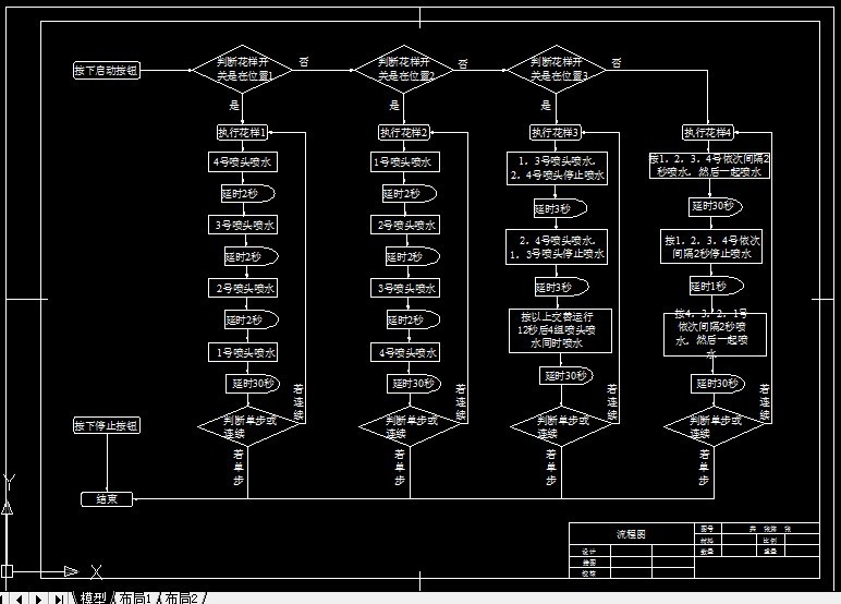 使用PLC 控制花式喷泉,具有使用方便、运行可靠、控制程序设计简单等优点。用梯形图方法编程,可以使设计思路清晰,编程简便。若需要改变喷水花样和喷水时间,设计方案不必作很大调整,只要把控制程序作相应的修改,即可实现控制目的。