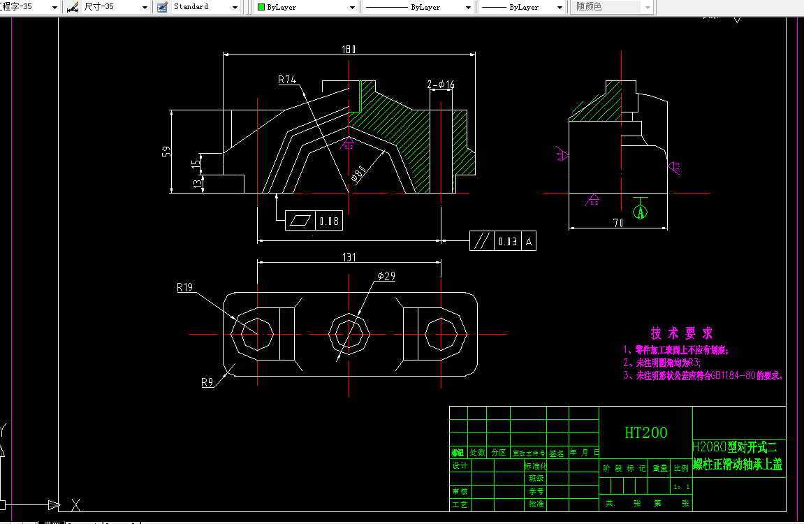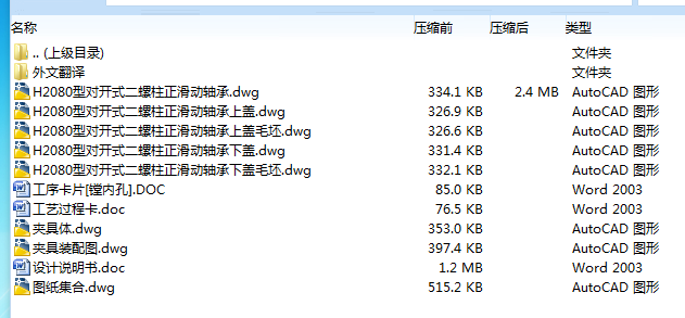 H2100型对开式二螺柱正滑动轴承零件加工工艺及夹具设计是包括零件加工的工艺设计、工序设计以及专用夹具的设计三部分。在工艺设计中要首先对零件进行分析,了解零件的工艺再设计出毛坯的结构,并选择好零件的加工基准,设计出零件的工艺路线;接着对零件各个工步的工序进行尺寸计算,关键是决定出各个工序的工艺装备及切削用量;然后进行专用夹具的设计,选择设计出夹具的各个组成部件,如定位元件、夹紧元件、引导元件、夹具体与机床的连接部件以及其它部件;计算出夹具定位时产生的定位误差,分析夹具结构的合理性与不足之处,并在以后设计中注意改进。