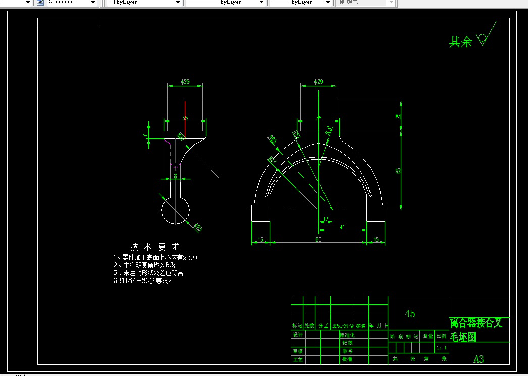 本次设计主要内容:设计离合器接合叉加工工艺及铣夹具工艺装备并绘制出支架零件图、毛坯图、夹具装配图,填写工艺卡片,编制课程设计说明书。