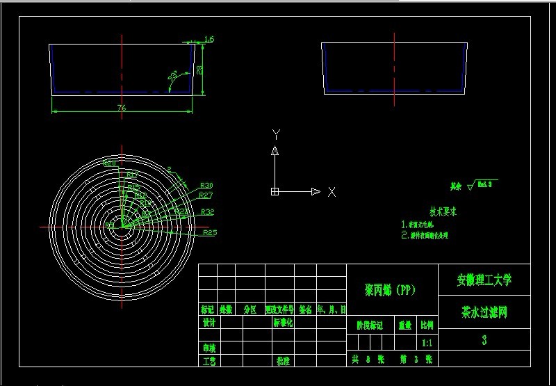 本设计主要是针对茶水过滤网的模具设计,通过对塑件进行工艺的分析和比较,最终设计出一副注塑模。该设计从产品结构工艺性,具体模具结构出发,对模具的浇注系统、模具成型部分的结构、顶出系统、冷却系统、注塑机的选择及有关参数的校核、都有详细的设计,同时并简单的编制了模具的加工工艺,对注射机进行了校核分析。通过整个设计过程表明该模具能够达到此塑件所要求的加工工艺。根据题目设计的主要任务是茶水过滤网注塑模具的设计。也就是设计一副注塑模具来生产茶水过滤网塑件产品,以实现自动化提高产量。针对茶水过滤网的具体结构,该模具是侧浇口的单分型面注射模具。通过模具设计表明该模具能达到茶水过滤网的质量和加工工艺要求。在设计中通过AutoCAD和Solidworks的运用使得设计更加合理经济。
