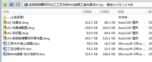 吊耳前钢板弹簧加工工艺规程及其铣Φ44端面的夹具设计是包括零件加工的工艺设计、工序设计以及专用夹具的设计三部分。在工艺设计中要首先对零件进行分析,了解零件的工艺再设计出毛坯的结构,并选择好零件的加工基准,设计出零件的工艺路线;接着对零件各个工步的工序进行尺寸计算,关键是决定出各个工序的工艺装备及切削用量;然后进行专用夹具的设计,选择设计出夹具的各个组成部件,如定位元件、夹紧元件、引导元件、夹具体与机床的连接部件以及其它部件;计算出夹具定位时产生的定位误差,分析夹具结构的合理性与不足之处,并在以后设计中注意改进。