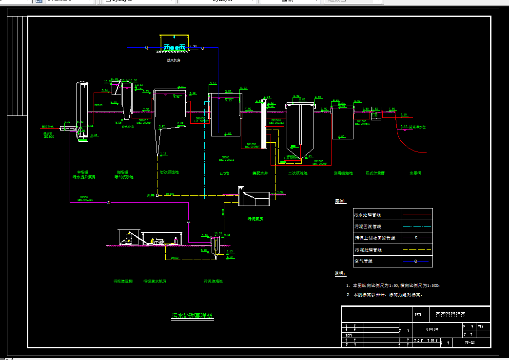 污泥处理流程:剩余污泥 → 浓缩池 → 贮泥池→ 污泥脱水机房 → 泥饼外运。