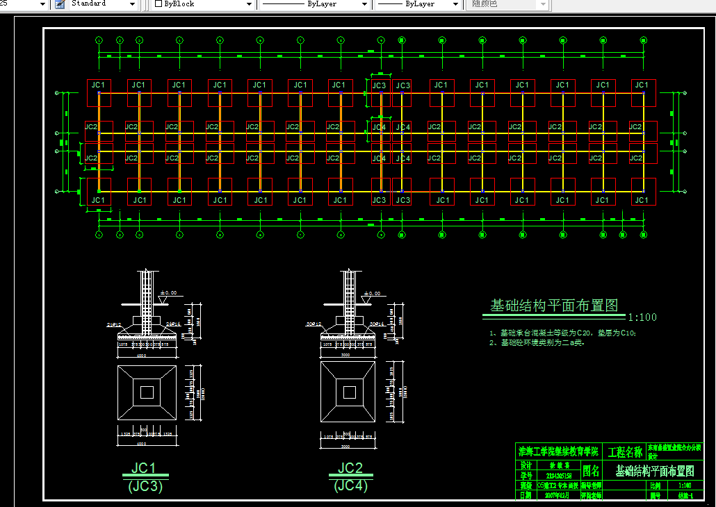结构概况:结构体系框架结构,基础为柱下独立基础, 基础垫层混凝土为C10,基础承台混凝土为C20,其余混凝土为C30。