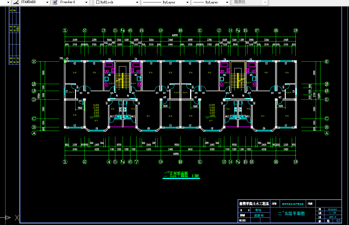 本建筑为襄樊市某房地产商住楼,设计六层,底层为商铺,二~六层为住宅。建筑总长为40m,总宽为12m,总高为20.350m。底层商住楼层高为3.9m,住宅层高为3m。考虑商住楼的要求及房间布置,平面尺寸应简洁、规则。